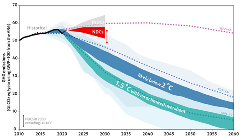 Grafen ovan visar utvecklingen av växthusgasutsläpp baserat på länders nuvarande klimatåtaganden (NDCs), jämfört med hur utsläppen måste minska enligt IPCCs scenarier för att klara 1.5 respektive 2 graders-målet.